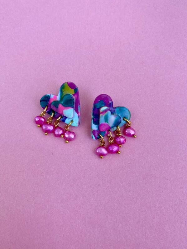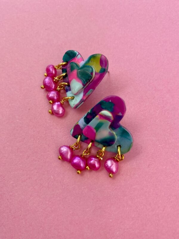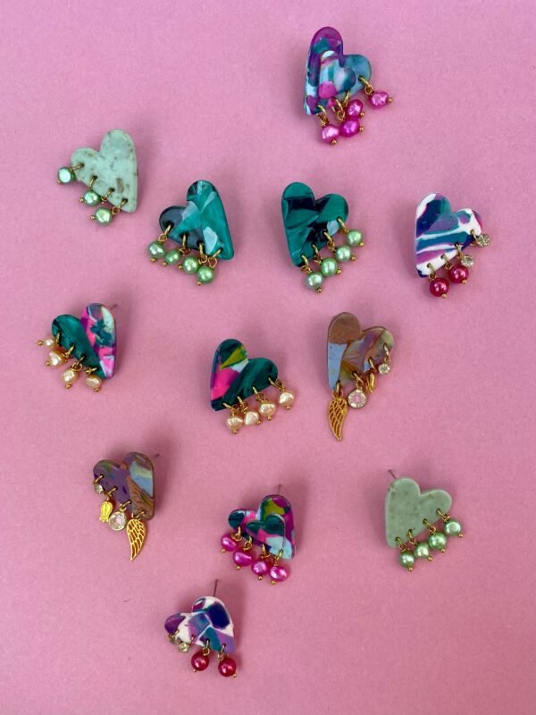 Discover our charming handmade polymer clay earrings, featuring delicate little hearts that gracefully dangle. Each pair offers unique style with either four tiny chain elements or sweet pearls, available in a variety of colors and adorned with different small, discreet charms. These versatile earrings are perfect for adding understated elegance to any outfit, any time.